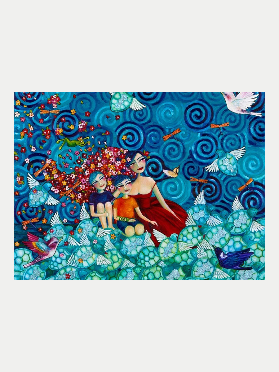 Lady and Her Two Boys on Turtles